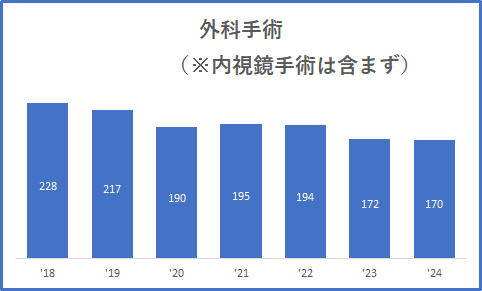 手術は、胃癌や大腸癌を中心に、炎症性腸疾患、胆石、虫垂炎、鼠径ヘルニア、痔などに対して行っています。胃癌や大腸癌に対しては術前検査にて方針を検討し開腹手術または腹腔鏡手術にて適切な治療を行っています。最近では腹腔鏡手術が増加してきており、鼠径ヘルニアに対しても腹腔鏡手術を導入しています。肛門疾患では、薬物治療で治らない痔核・痔瘻に対しては手術も行います。内痔核を切らずに治す硬化療法(ALTA療法)も導入して行います。