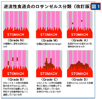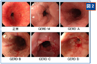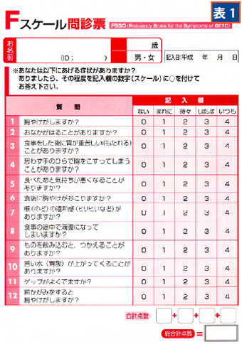ヘリコバクター. ピロリ(以下H.P 菌)という細菌が胃粘膜に寄生していることが胃潰瘍、十二指腸潰瘍、胃炎、胃がんの原因ということが分かり、H.P 菌の除菌が広く行われるようになりました。それにともないH.P 菌の除菌では治療できない胃食道逆流症(以下GERD)が問題視されるようになり治療ガイドラインも作成されており、昨今ではTV のCM にも登場するようになりました。上部内視鏡〈胃カメラ〉検査を多数おこなっている当院でも当然、多数のGERD の患者さんが来院されます。今回は当院でのGERD の現状についてお伝えし、GERD とどう向き合っていくかの参考にしていただければよいかと思います。検討時期は2009 年10 月から2010 年3 月まで。F-scale(後述)の検討については2005 年4 月に行ったものです。GERD は胃内容物の食道への逆流や食道運動の異常により、「胸焼け」を典型的な症状とし(問診表)、時に喘息、慢性の咳、咽頭炎、非心臓性胸痛など食道以外の症状など多彩な自覚症状や合併症を生じる病態です。診断については自覚症状を基本とした専用の問診表があり, それに従って診断ができます(F-scale)(表1)。重症度には内視鏡所見による分類が使われており(LOS 分類)(図1)、N.M.A.B.C.D の順に内視鏡所見では重症となります( 図2)。