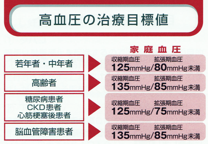 - 家庭血圧は1 3 5 / 8 5 m m H g 以上は治療対象、1 2 5 / 7 5 m m H g 未満を正常血圧。