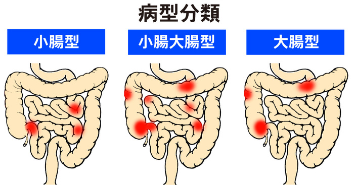 主な症状としては腹痛や 下痢、血便、体重減少、肛門痛などです。クローン病では、口腔から肛門に至るまでの消化管のどの部位にも炎症や潰瘍が起こりえますが、小腸の最後の部分である回腸と大腸が好発部位であり、できる場所に応じて「小腸型」、「大腸型」、「小腸・大腸型」に分類されます。
