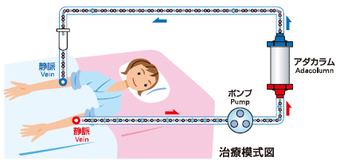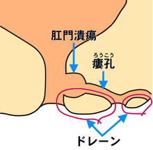 クローン病の原因は現時点では不明であり、根本的な治療法は今のところありません。薬物療法や栄養療法を組み合わせて行い、腸の炎症を抑えて栄養状態を改善させます。白血球吸着除去療法(GCAP)を組み合わせて行う場合もあります。最近では、レミケードやヒュミラなどの抗TNF α製剤の投与により、病状が安定することが多くなりました。しかし炎症が長く続くことにより、腸が狭くなったり(狭窄)、腸に穴が空いたり(穿孔)、膿の固まり(膿瘍)などが原因となり、薬での治療で改善できない場合には、腸を切除するなどの手術が必要となることもあります。クローン病の痔瘻は、通常の手術では治らないことが多く、シートン法による手術を行います(図)。