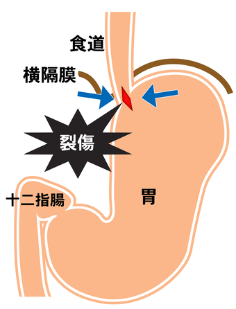 マロリー・ワイス症候群や特発性食道破裂は、繰り返しかかる腹圧によって食道と胃の境目の壁が何度も勢いよく広げられ、粘膜面が縦方向に裂けることで起こります。アルコールを飲んだ後に嘔吐を繰り返すことが原因となることが多いといわれていますが、それ以外に、しゃっくり、くしゃみ、咳、喘息発作、腹部打撲、排便や出産時のいきみなどが原因となる場合もあります。